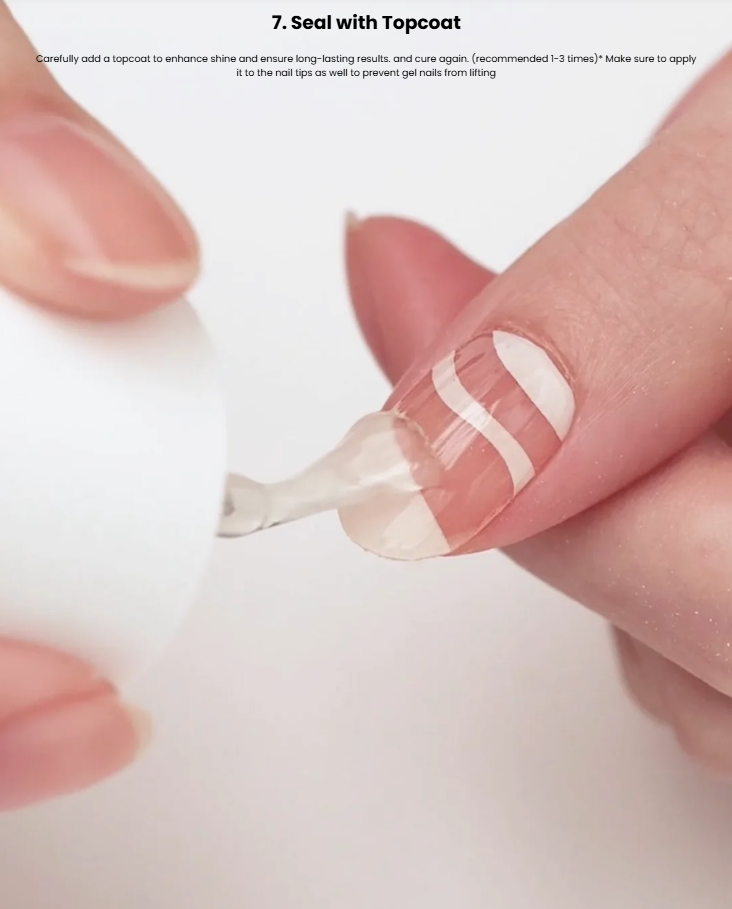 Sellador: Si desea aún más brillo y durabilidad, aplique una capa de top coat, incluso en las puntas, y cure una vez más.